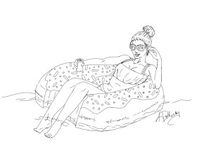 The angles of her legs were something I redrew multiple times. None of my reference pictures had a floating tube much like this one. I did find one that was someone using the donut floatie, but it wasn’t in the pose that was close to what I wanted. I am really excited to color in the water reflections on the tube and on her legs!