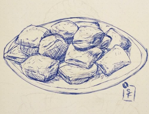 Today’s post is Beignets! I actually wasn’t sure how they would come out for a sketch. I feel like these would be pretty hard to do. They are basically fried dough with powdered sugar on them. I feel like they still came out pretty well though.